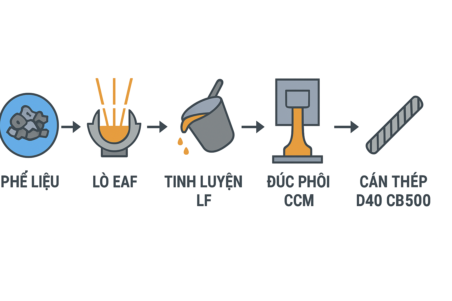 👉 Tại Thép Miền Nam /V/, phôi thép được sản xuất từ lò hồ quang điện EAF hiện đại, kết hợp tinh luyện ngoài lò, giúp loại bỏ tạp chất, khử khí, khử lưu huỳnh – phospho triệt để, tạo ra phôi thép tinh khiết, đồng đều, nền tảng để sản xuất thành công thép D40 CB500 chất lượng cao.